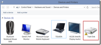 After updating to Windows 8.1 Update 1, my wife installed a USB flash drive that previously gave her no problems, and now wouldn’t show as a drive in Explorer. I got the same error on my (also updated) computer.